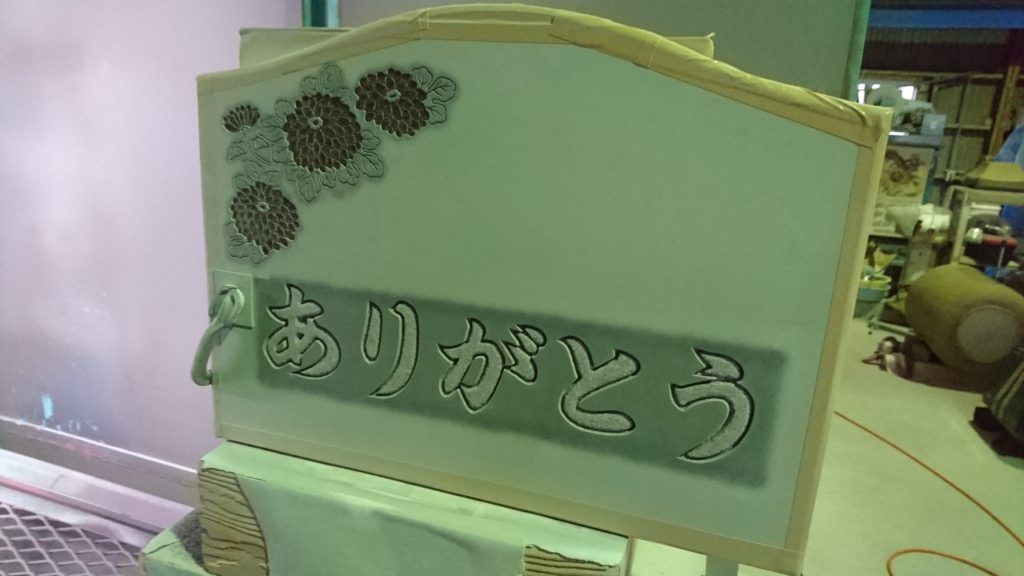 「ありがとう」の文字はそのまま彫り込んでいくのではなく、縁を彫ったあと、文字の角を丸くするように彫っていきます。こうすることによって文字がはっきり見え、よごれがつきにくくなります。
