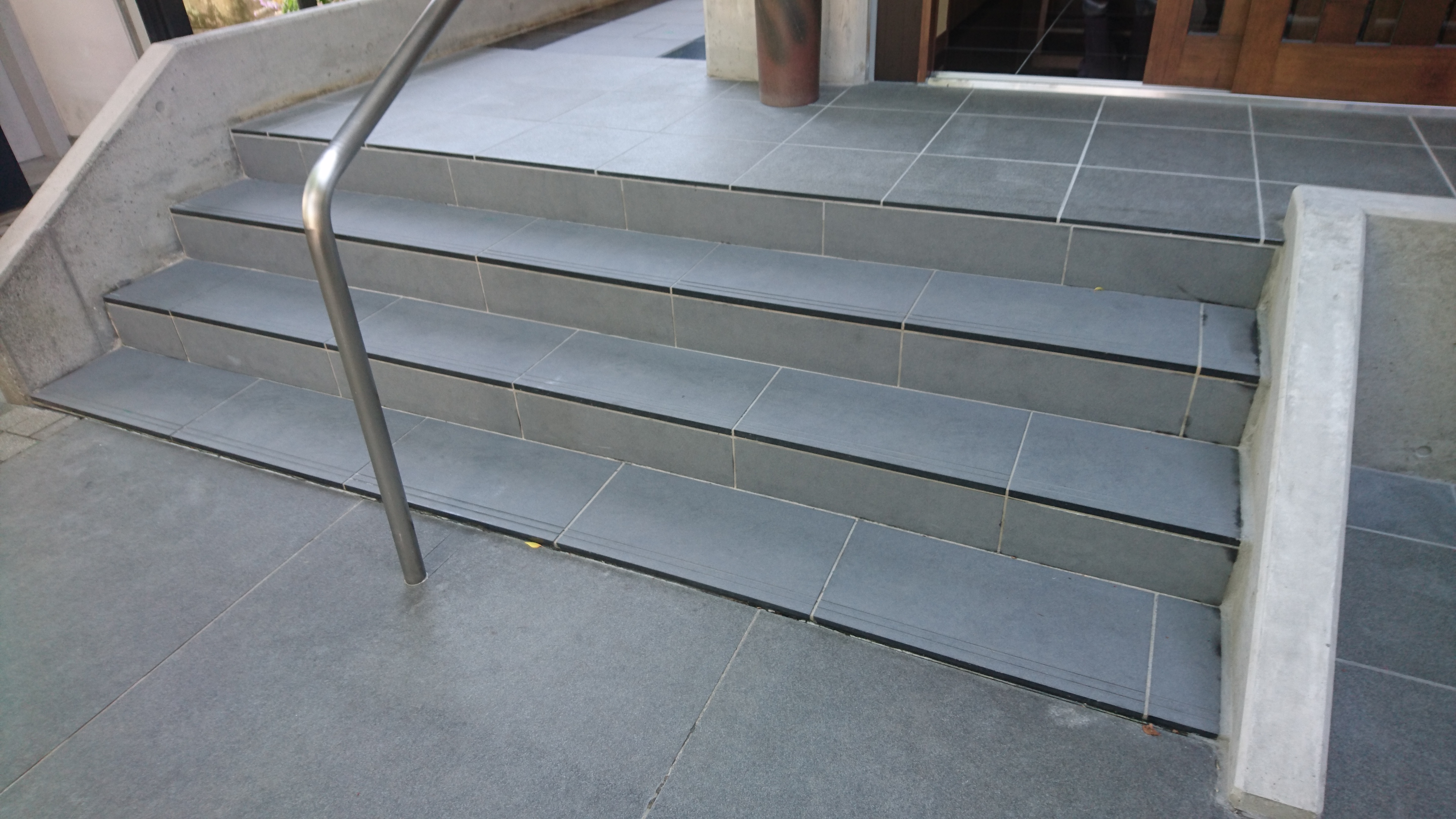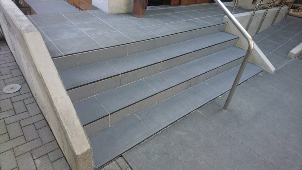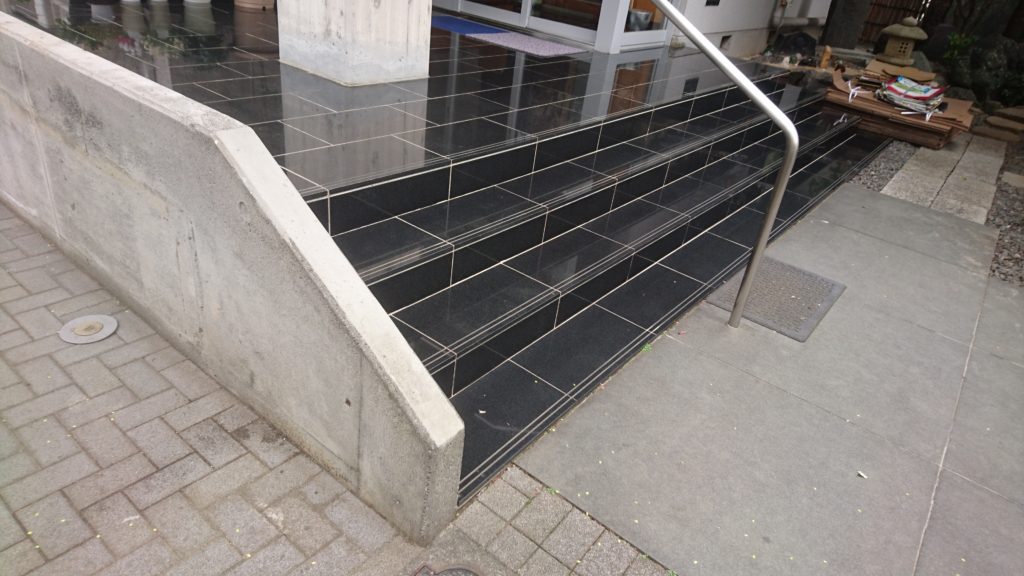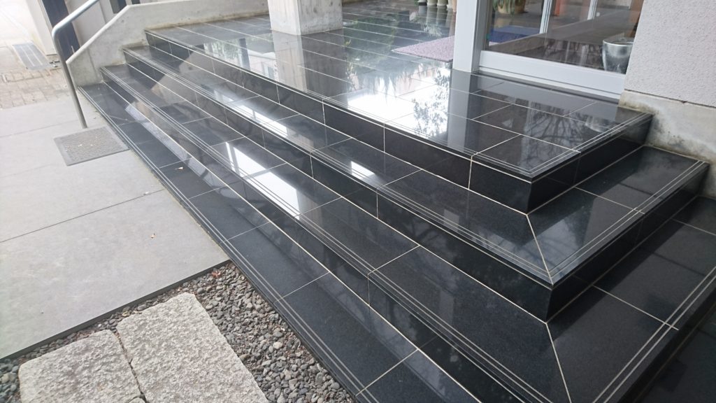 階段のステップ3段分と、その奥の通路部分をサンドブラストで表面を仕上げました。バーナー仕上げの場合、表面は割とでこぼこになりますが、サンドブラスト仕上げだとつや消しのようなマットな感じになります。現場作業での苦労としては、砂や埃が飛び散らないように養生すること、下向きでの長時間の作業になるため肉体的に大変なこと、むらにならないように細心の注意が必要なことがあげられます。